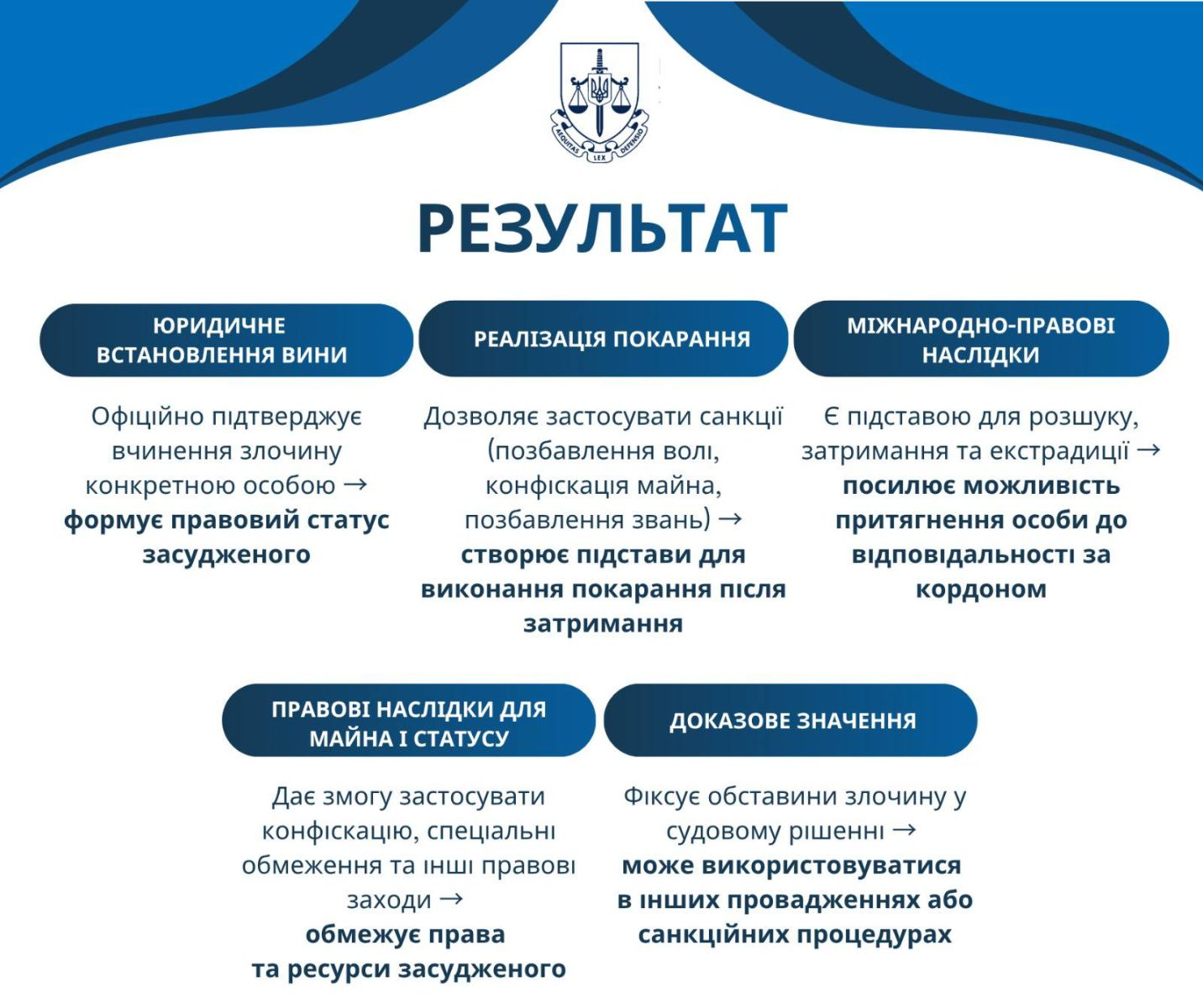 Заочний судовий розгляд дозволяє юридично встановити вину особи, формує правовий статус засудженого та дає підстави для застосування санкцій, включно з позбавленням волі, конфіскацією майна та позбавленням звань.