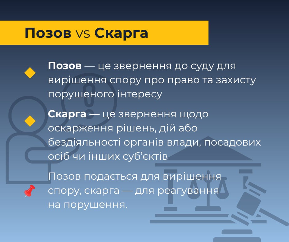 Скарга — це звернення щодо оскарження рішень, дій або бездіяльності органів влади, посадових осіб чи інших суб’єктів. Позов подається для вирішення спору, скарга — для реагування на порушення.