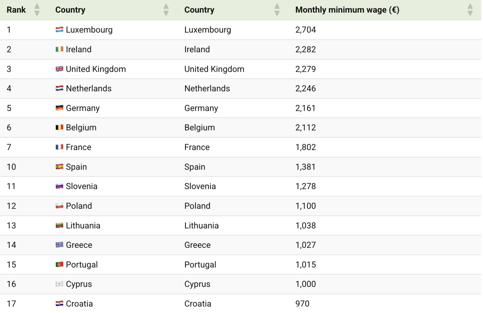 Найвищу мінімальну зарплату зафіксовано у Люксембурзі — 2 704 євро на місяць. Водночас в Україні цей показник становить близько 164 євро. Таким чином, працівник у Люксембурзі отримує більш ніж у 16 разів більше, ніж в Україні.