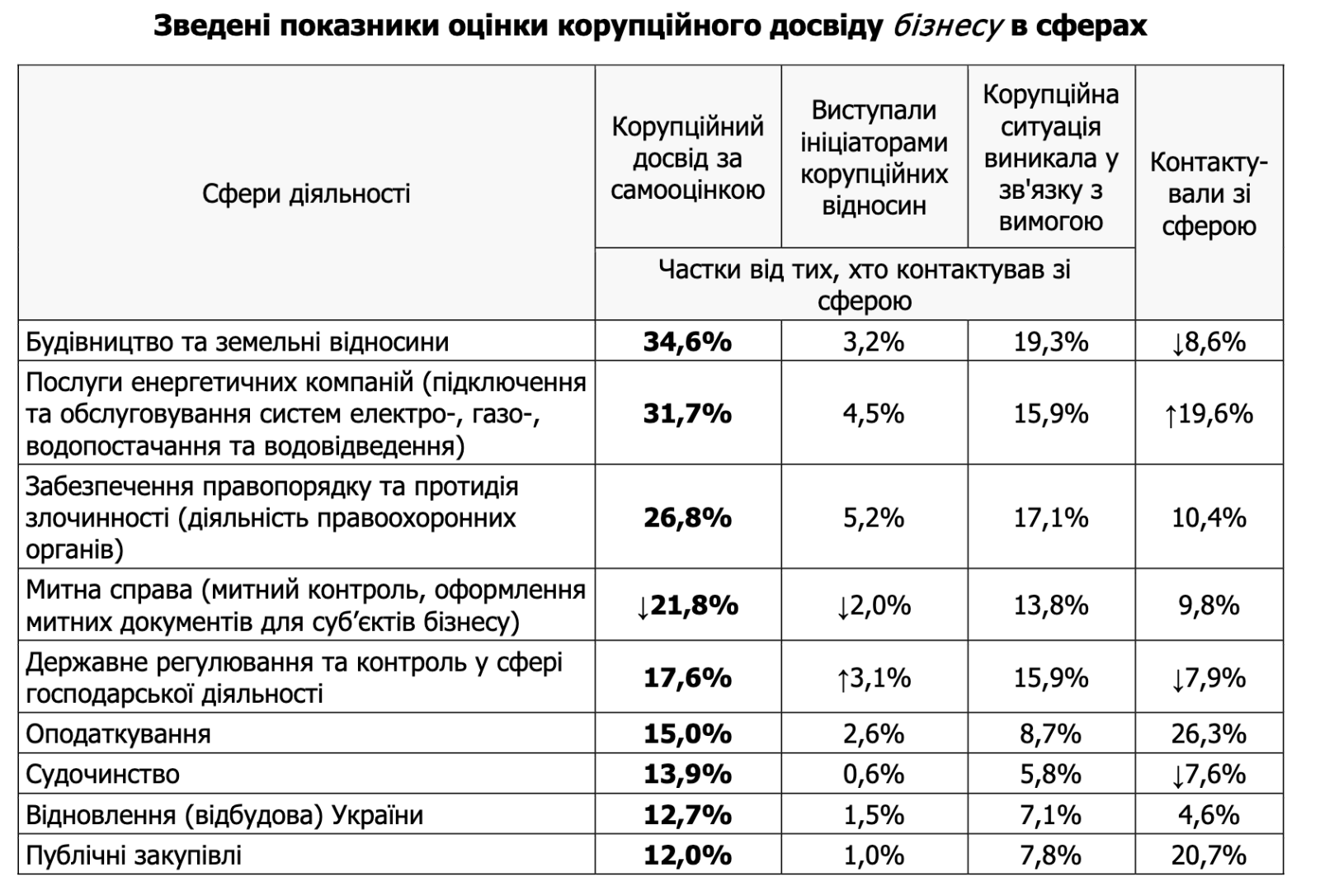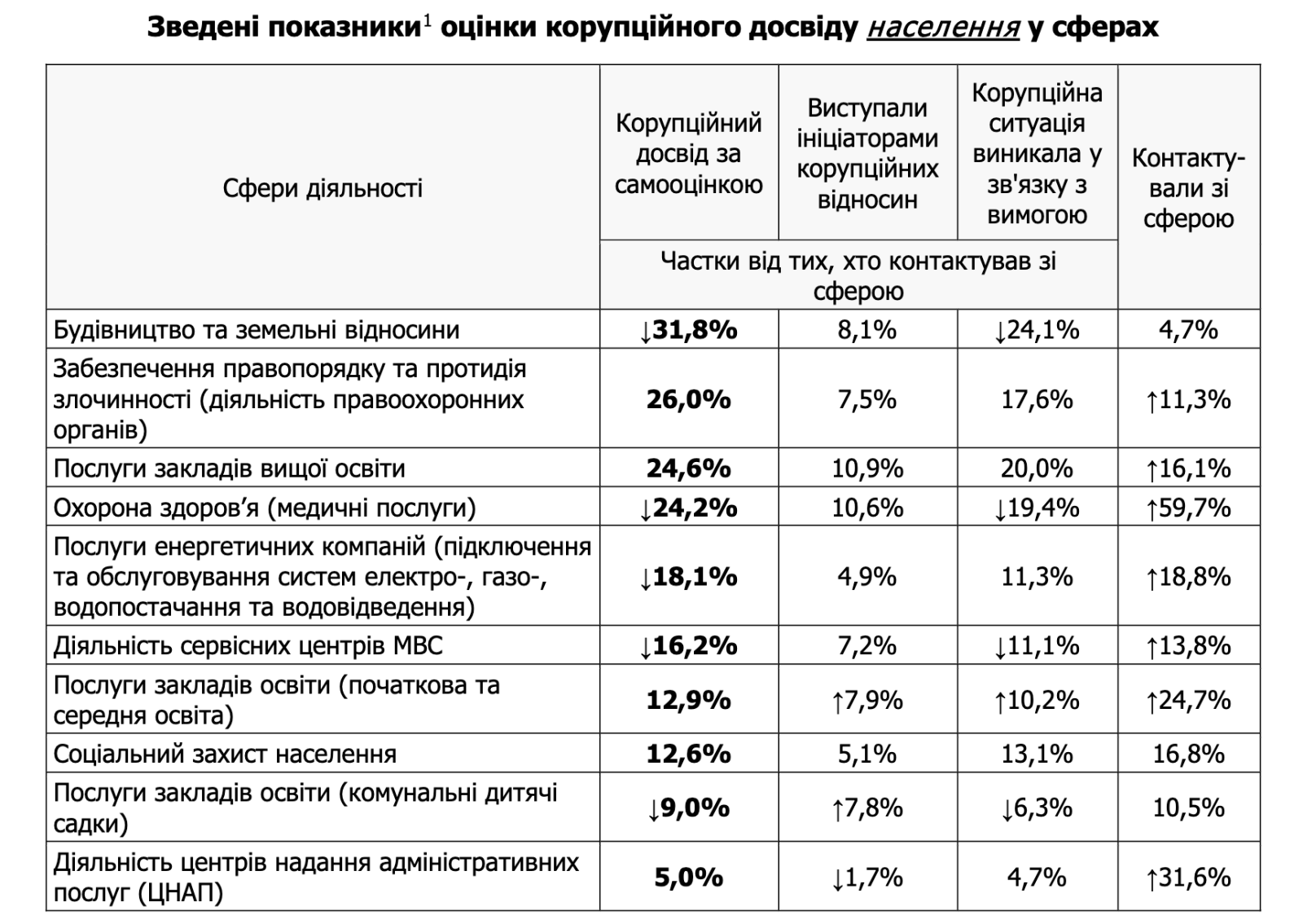 Водночас високими залишаються показники корупції у сферах забезпечення правопорядку та протидії злочинності (26%) та у закладах вищої освіти (24,6%) — за рік вони практично не змінилися.