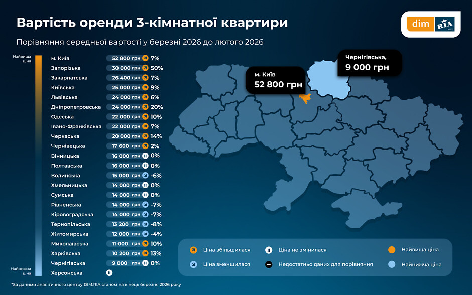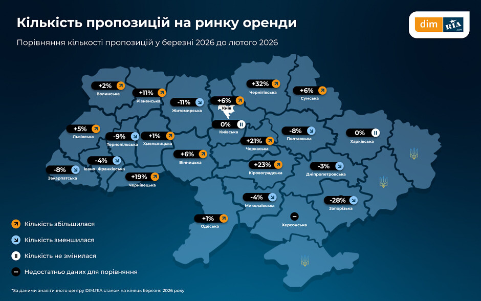 Найбільше зростання кількості оголошень про оренду зафіксували у Чернігівській (+32%), Кіровоградській (+23%), Черкаській (+21%) та Чернівецькій (+19%) областях. Водночас у Запорізькій області пропозиція скоротилася на 28%, а в Житомирській — на 11%.