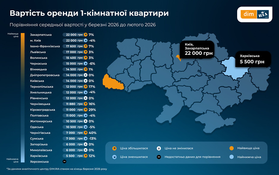У березні Київ поділив перше місце за середньою вартістю оренди однокімнатного житла із Закарпатською областю.