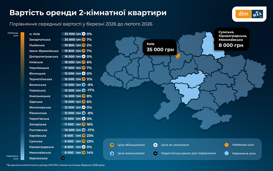 У березні 2026 року в Україні зафіксували різке зростання попиту на оренду житла та значні коливання цін. Про це свідчить аналітика сервісу DIM.RIA, який проаналізував ринок у порівнянні з лютим 2026 року та березнем 2025-го.