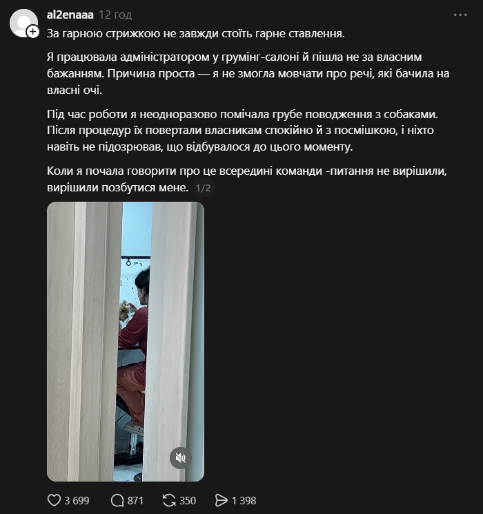 «За гарною стрижкою не завжди стоїть добре ставлення. Після процедур песиків повертали власникам спокійно й з посмішкою, і ніхто навіть не підозрював, що відбувалося до цього моменту», — зазначила вона.