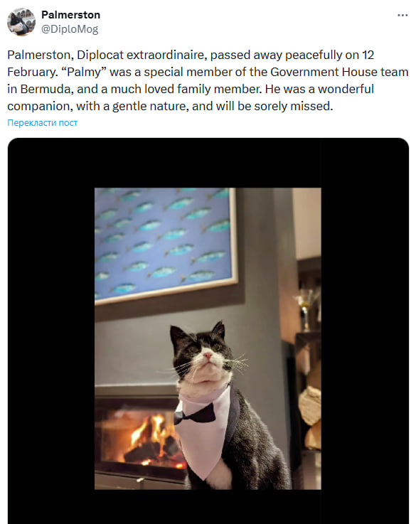 Умер кот Пальмерстон — бывший главный мышелов Министерства иностранных дел Великобритании. Об этом сообщили на странице аккаунта в соцсети X, который ведут от его имени.