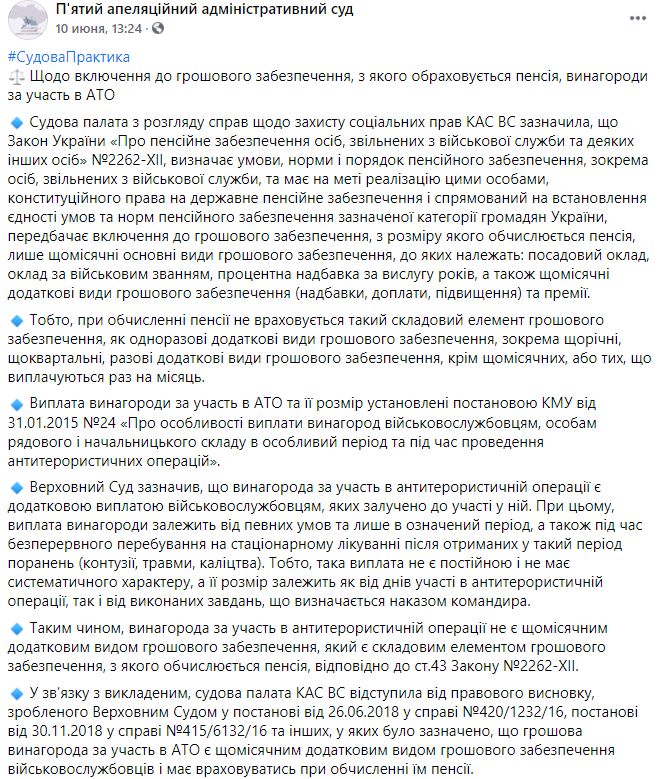 П'ятий апеляційний адміністративний суд оприлюднив позицію КАС ВС щодо включення до грошового забезпечення, з якого обраховується пенсія, винагороди за участь в АТО.