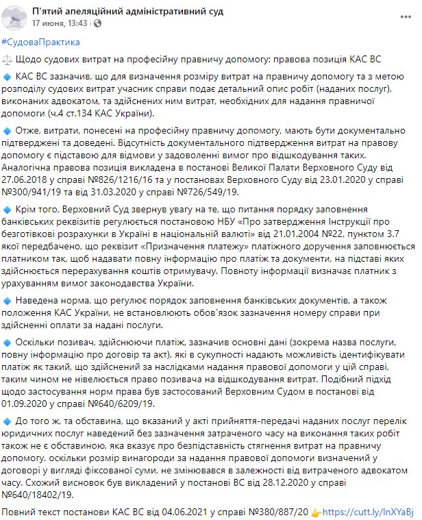 П'ятий апеляційний адміністративний суд оприлюднив правову позицію КАС ВС щодо судових витрат на професійну правничу допомогу.