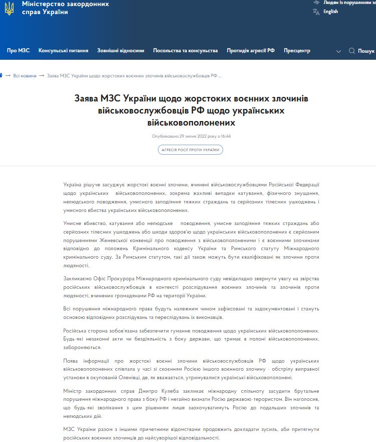 Отмечается, что жестокое обращение с военнопленными является серьезным нарушением Женевской конвенции и является военным преступлением в соответствии с положениями Уголовного кодекса Украины и Римского статута Международного уголовного суда.