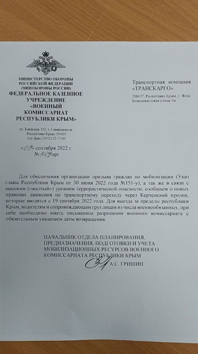 Издание также приводит документ, который предназначен транспортной компании «ТРАНСКАРГО» от военного комиссариата. В нем говорится об организации призыва по мобилизации, новых правилах перехода Керченского моста и ограничении выезда.