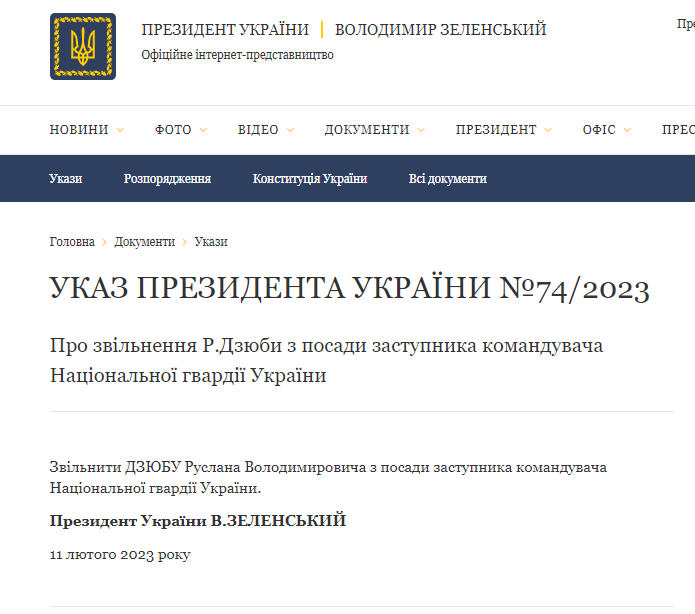 Согласно указу 74/2023 Президента Украины Владимира Зеленского был уволен заместитель командующего Нацгвардией Украины.