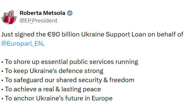 Президент Европарламента Роберта Мецола подписала кредит для Украины на 90 млрд евро