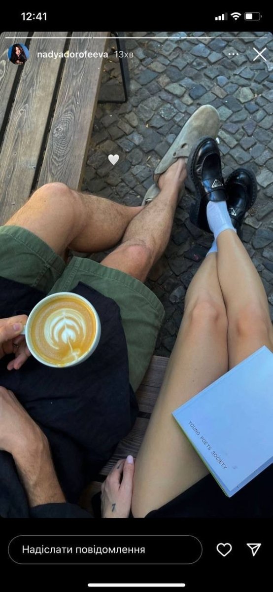 На фото Дорофеева сидит на скамеечке одной из уютных улочек. Лиц пары не видно, на кадре только ноги Нади и мужчины.