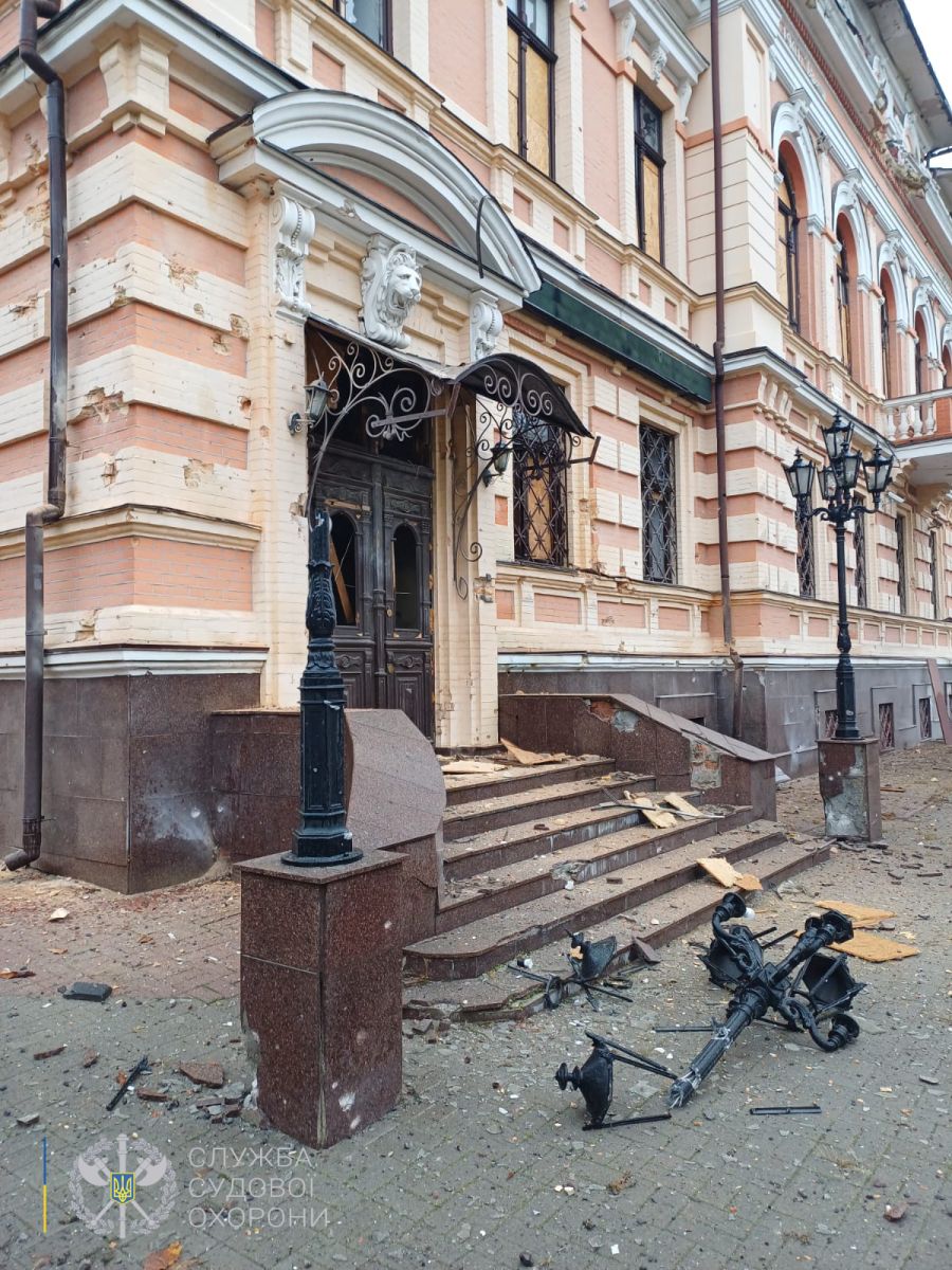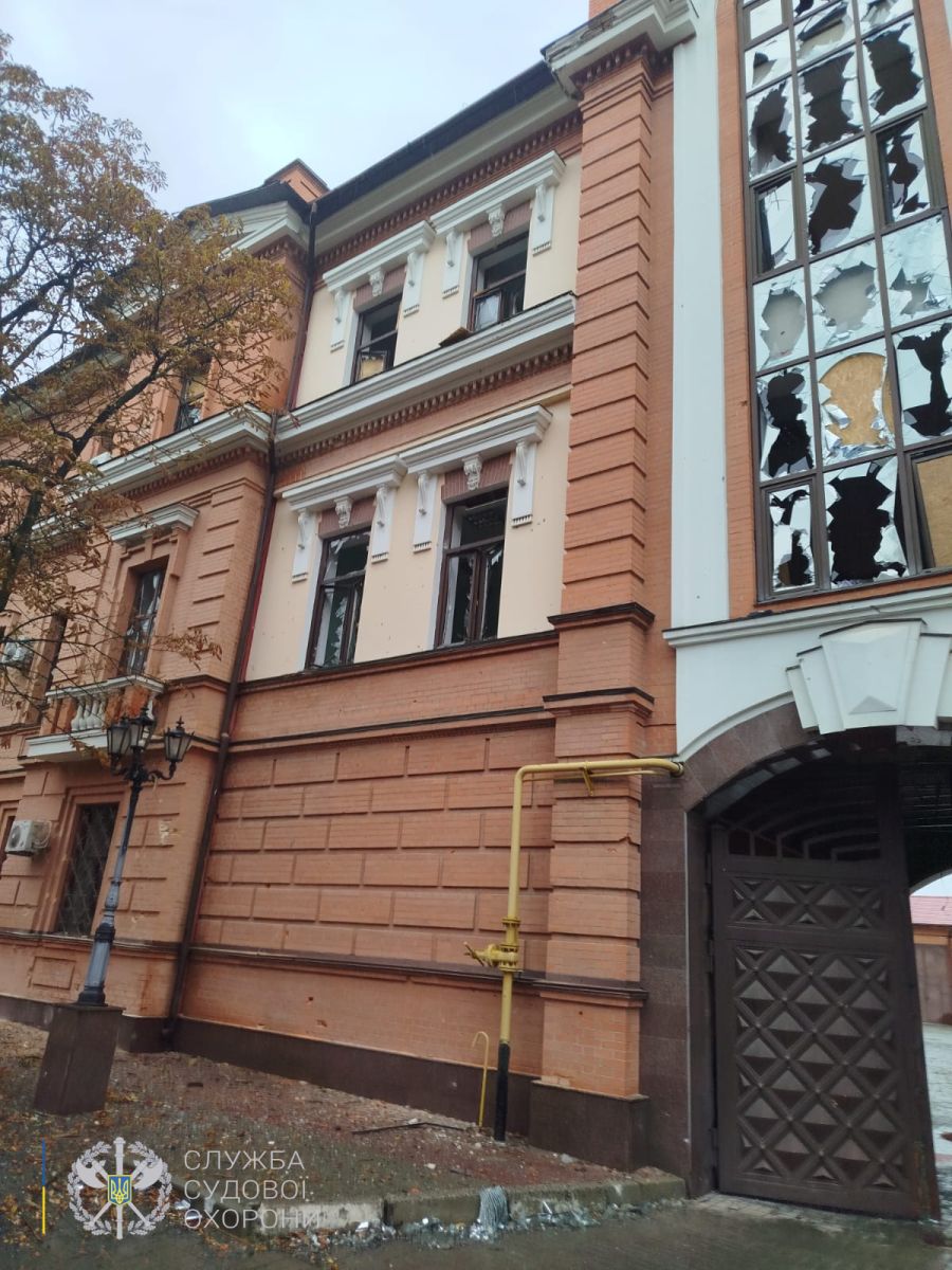 У Херсоні внаслідок декількох ворожих обстрілів сильних ушкоджень зазнала установа системи правосуддя. Вибуховою хвилею вибито шибки у майже 100 вікнах, пошкоджено дах будівлі, службове та особисте майно працівників установи та судових охоронців. Про це розповіли у Службі судової охорони.