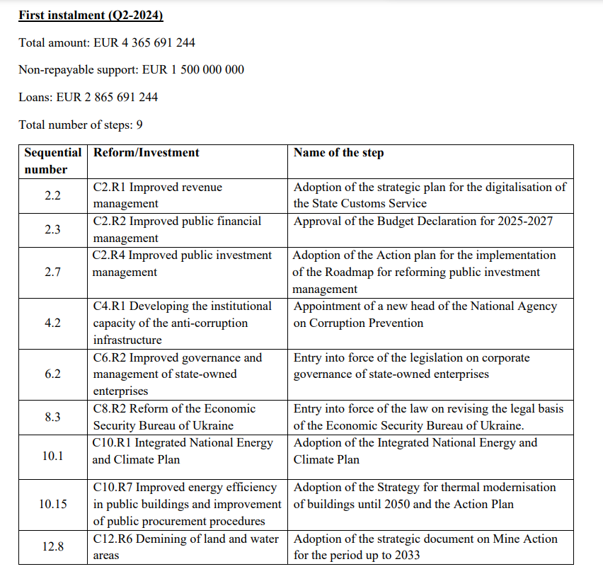 Зокрема, за програмою Ukraine Facility на другий квартал 2024 року передбачений внесок європейських партнерів, загальна сума якого складає до 4,365 млрд євро, з яких безповоротна підтримка до 1,5 млрд євро, а позика Україні – до 2,865 млрд євро.